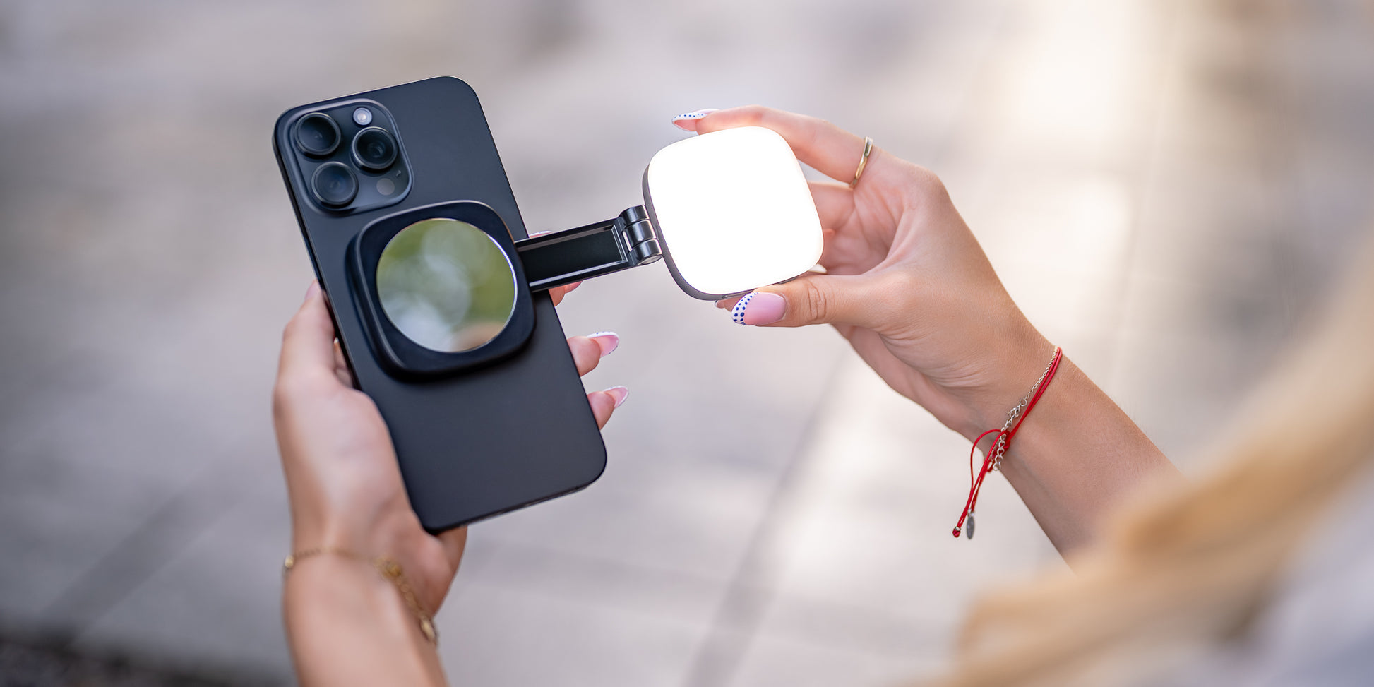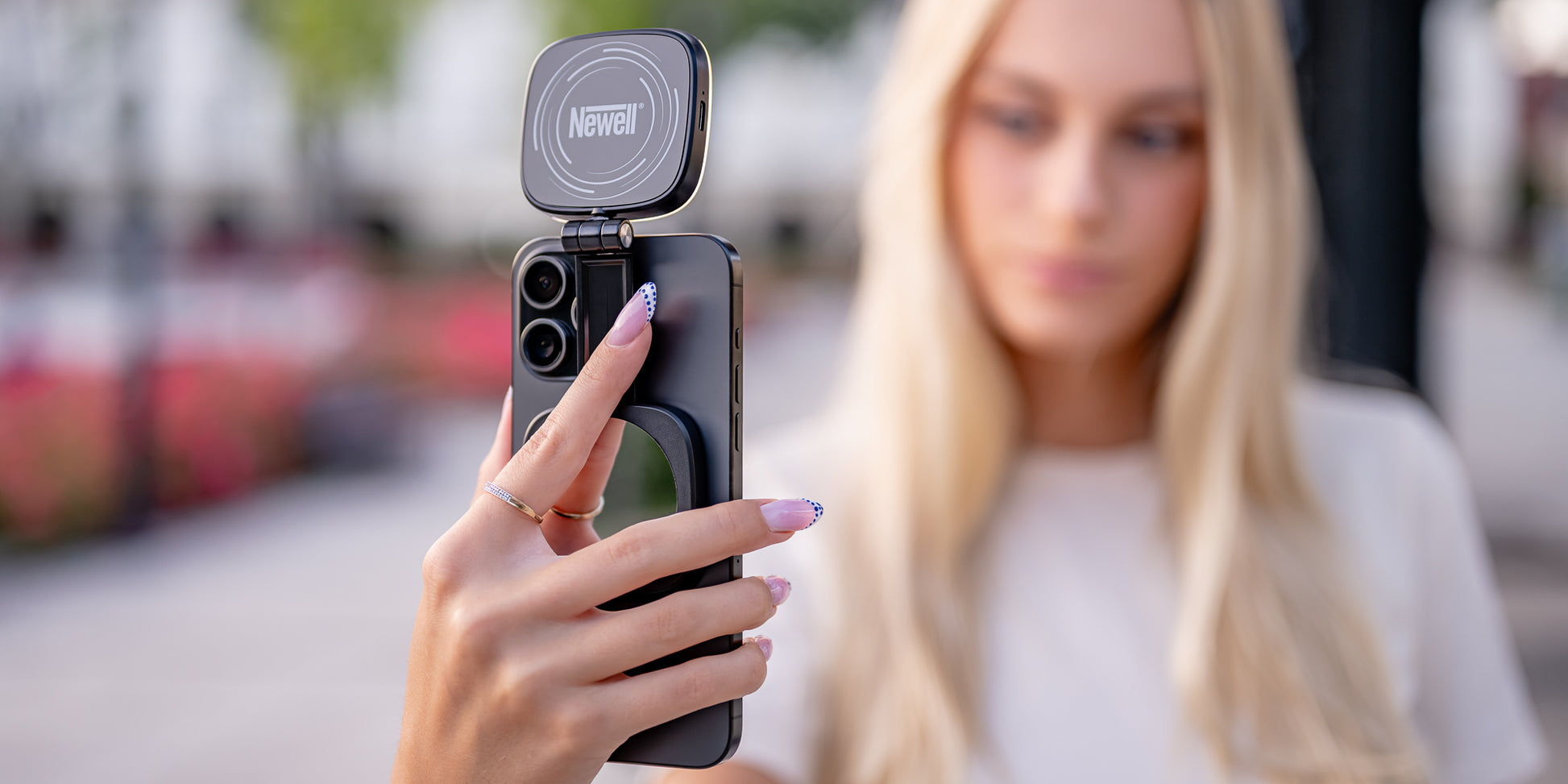 Newell Bella funktioniert perfekt mit der MagSafe-Technologie und bietet eine schnelle und sichere Verbindung zu Ihrem iPhone, ohne zusätzliche Halterungen. Alles, was Sie tun müssen, ist, die Leuchte auf der Rückseite Ihres Smartphones anzubringen, und ein starker Magnet positioniert sie automatisch an der richtigen Stelle. Eine zeitsparende Lösung, die den gesamten Prozess der Aufnahme, des Fotografierens oder des Videotelefonierens vereinfacht. Die Newell Bella-Leuchte hält ihre Position auch bei Bewegung hervorragend und verwandelt Ihr Smartphone in ein kompaktes Studio mit professioneller Beleuchtung - genau dann, wenn Sie sie brauchen.