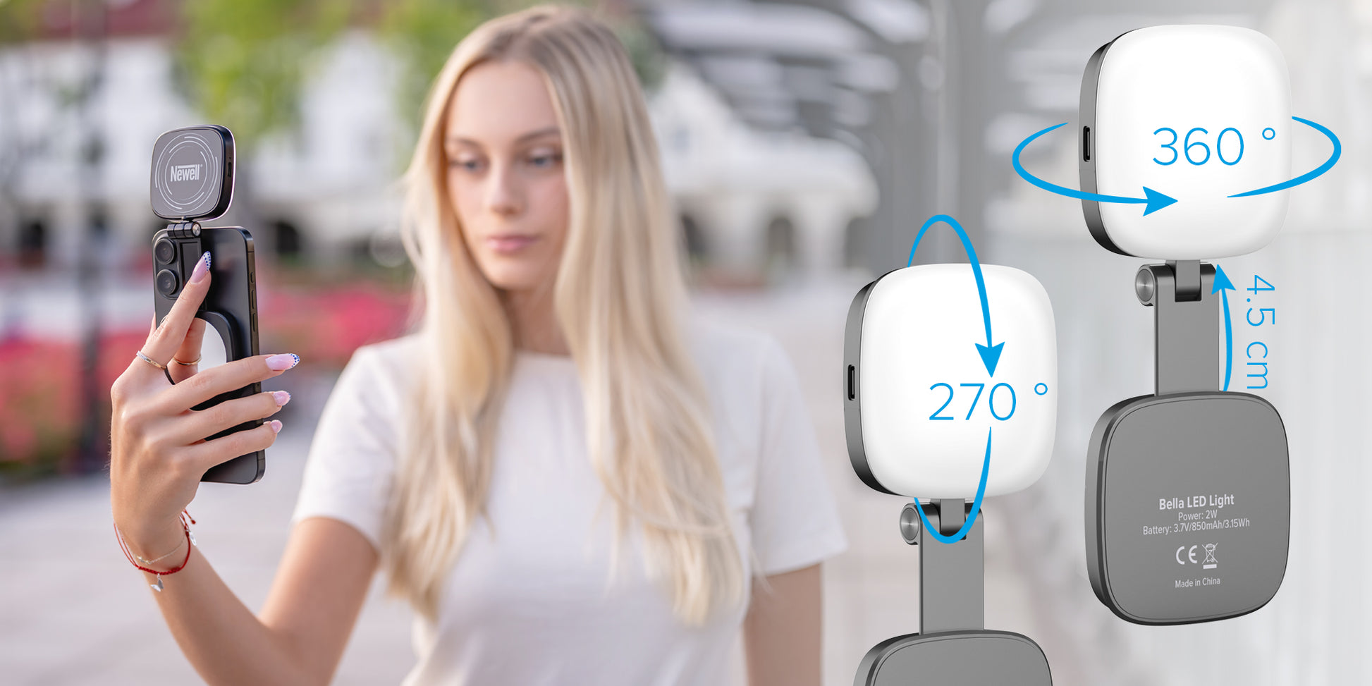 Mit ihrem um 360° drehbaren Kopf und dem Zwei-Wege-Neigungssystem kennt die Newell Bella keine Grenzen, wenn es darum geht, Licht zu lenken. Sie können von oben, von der Seite oder von vorne leuchten - egal, ob Sie Ihr Telefon horizontal oder vertikal halten oder ein Selfie mit der Rückkamera machen. Die Änderung des Winkels ist eine Sache von Sekunden. Mit dieser Leuchte passen Sie das Licht an die Szene an, nicht umgekehrt - volle Flexibilität bedeutet mehr Raum für Kreativität und weniger Frustration.