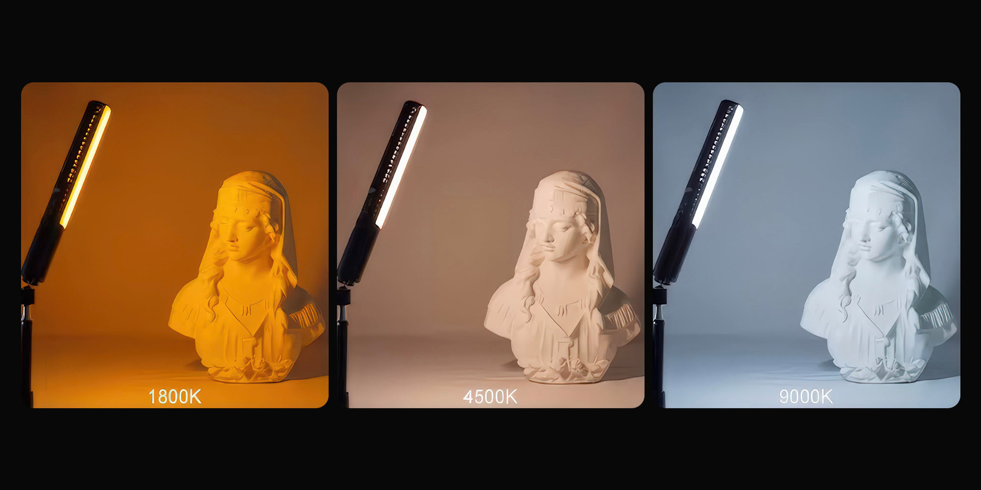 Die Newell RGB Kathi III LED-Lampe bietet einen breiten Bereich zur Einstellung der Farbtemperatur - von 1800 K bis 9000 K. So können Sie das Licht ganz einfach an die Gegebenheiten anpassen oder bewusst eine bestimmte Atmosphäre schaffen - vom sehr warmen Licht der untergehenden Sonne, ideal für Porträts und Beauty-Aufnahmen, bis hin zur kühlen, neutralen Studiobeleuchtung. Die sanfte Anpassung sorgt für natürliche Übergänge und eine einfache Steuerung des Weißabgleichs während der Aufnahme.